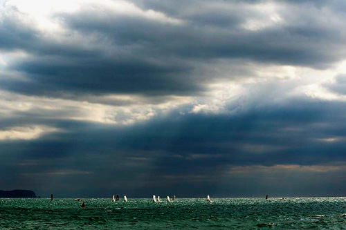 As the morning progressed and the skies cleared the sailors tuned their equipment whilst keeping one eye on the switching wind. The onshore breeze took a turn for the better as midday approached allowing four heats of elimination 8 to be completed. With winds blowing between 8-12 knots on the inside marks the sailors took to the water on their biggest equipment.