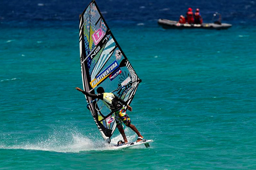 Winds blowing just below the suitable level for competition teased the sailors throughout the day. Occasionally large gusts blew over the competition area providing enough time for the sailors to hit the azure water, pump onto the plane, and pull their gravity-defying maneuvers.