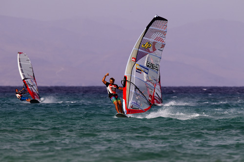 An exhilarating race saw Van Der Steen claim his first elimination in Fuerteventura. Volwater hit the start-line on form, charging ahead of the rest of the fleet, followed by, Van Der Steen, Albeau and Buzianis. Meanwhile, Bjorn Dunkerbeck suffered at the start and he was caught behind the rest of the fleet unable to pass. At the first mark Albeau lost control of his equipment and went down allowing Van Der Steen, Volwater and Cyril Moussilmani the advantage. Van Der Steen turned on his turbo-chargers for the remainder of the race to gain some ground ahead of the rest of the fleet and take the win. Albeau and Dunkerbeck were fighting to recover their positions, but it was too little too late, as they finished in seventh and fourth place respectively.