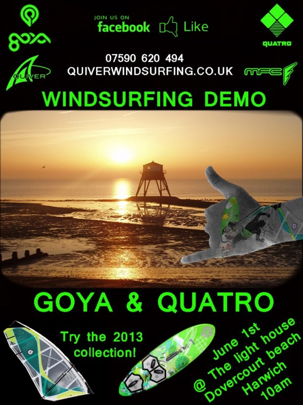 On the 1st of June Quiver windsurfing school are hosting a Goya and Quatro demo, with fresh, new 2013 gear for you to try! Contact Quiver windsurfing on the contact details below to confirm your attendance or for more details.
