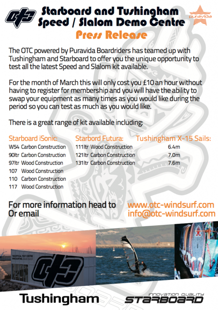 The OTC powered by Puravida Boardriders has teamed up with Tushingham and Starboard to offer you the unique opportunity to test all the latest Speed and Slalom kit available.