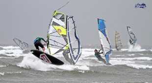 Due to the extreme conditions only 12 out of over 100 registered participants decided to put themselves forwards for the big race, including 8 windsurfers and 4 kiters. A convoy of vans ferried them to the launch site, as discussion raged on the beach as to which sport would prevail. With the score tied 1-1, this year would see one sport pull ahead.