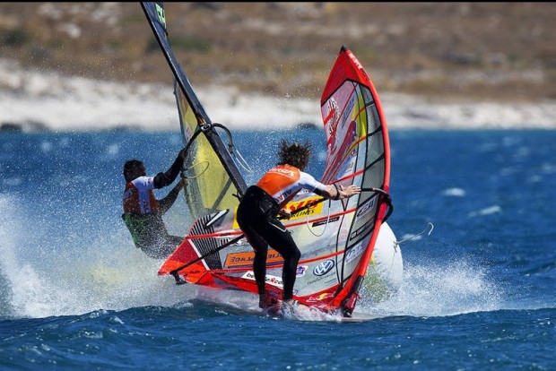 Here, two of the biggest men on the PWA tour Bjorn Dunkerbeck and Josh Angulo have gone head to head, quite literally. Racing in Alacati, these two got a little to close with Josh sailing almost straight on top of Bjorn, and ripping his sail from leech to luff.