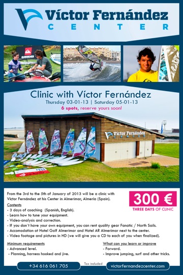 Want to start the new year in style? Victor Fernandez is running a clinic at his centre in Almeria, Spain from the 3rd to 5th January; it’s the perfect opportunity to pick up some wavesailing tips from the vice World Champion!