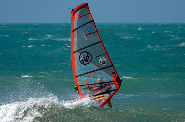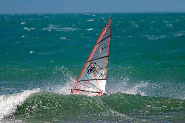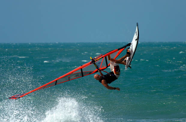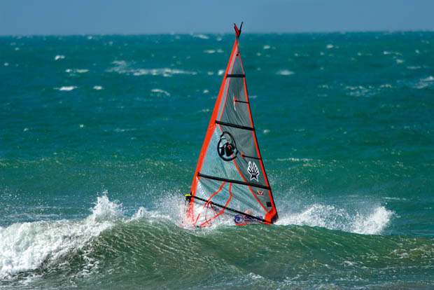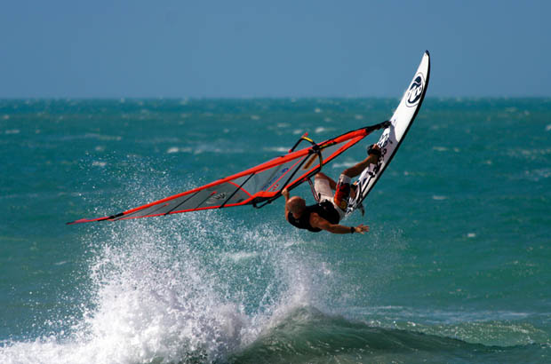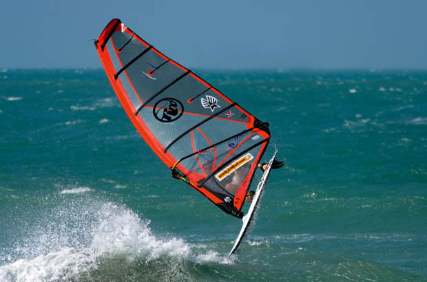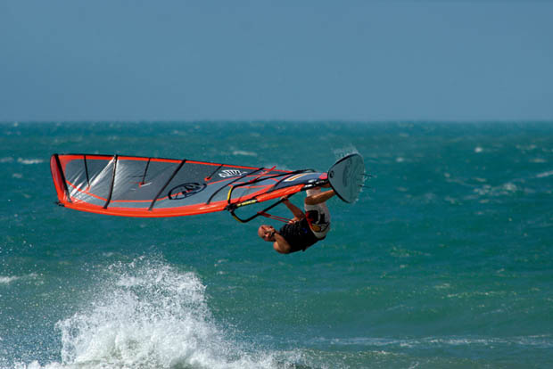 The conditions in Jeri, Brazil, were medium to slightly underpowered with waist-high ramps (could have been bigger), on a 5.2 Ezzy Wave Panther and RRD Wave Twin 90. After a few runs I’d mapped out where the suitable ramps were and I would come in, tack, get planing and absorb / pre-jump all the small stuff until I had full speed at the point where I was ready to launch into a one-hander. Find your spot or peak, keep making quick runs through it, and keep a good lookout ahead so you’re ready to soar, look and drop!