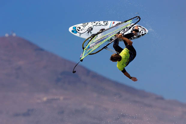 “Sorry – got a bit excited there! Here’s the tip. For really high backies when it’s very windy, it can help to keep both hands on the boom for a little bit longer after take-off. Jump high and control the move by keeping the rig in close to you, then once you’re at the top drop the hand and hold it off the boom as you look over your shoulder and spot your landing. This technique really helped me to learn them on my weaker port tack side.”