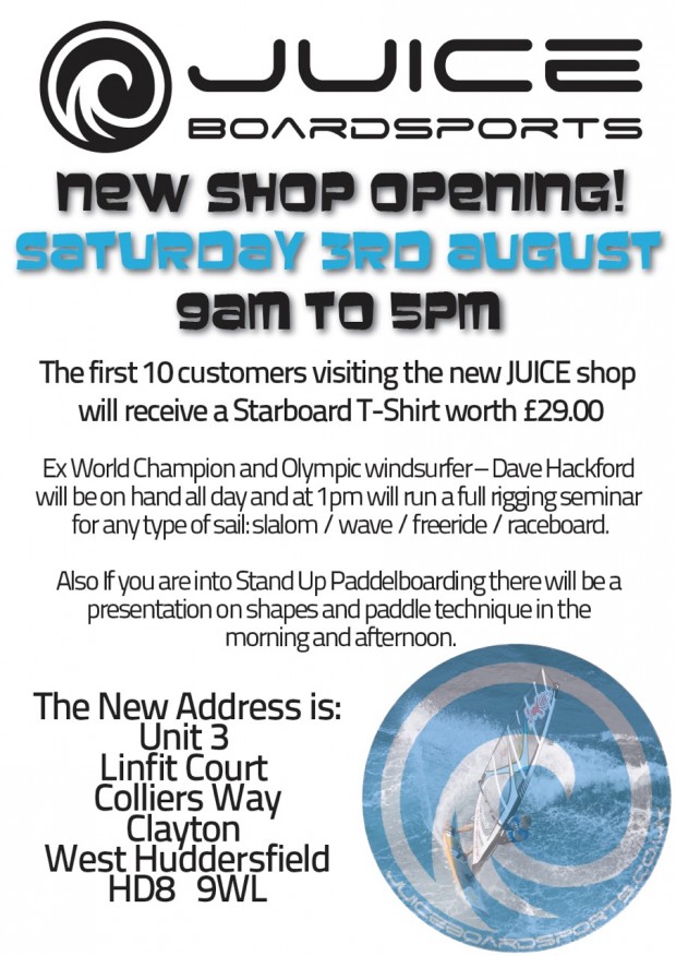 This Saturday the 3rd of August, Dave Hackford and Starboard/Tushingham will be attending the opening of Juice Boardsports. The first 10 customers through the door will receive a free Starboard t-shirt, worth £29.00!