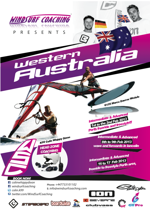 Colin Dixon and Marco Wedele of Windsurf Coaching are heading down under very soon, and we can confirm that they are coaching earlier in 2013! There’s a few dates throughout February, check the poster for full details.