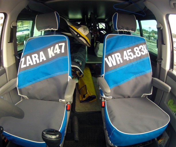Zara Davis is, and rightly so, still celebrating her speed world record that she set recently in Luderitz. Innovative ways of marking achievements are always welcomed, and Denise Enstone from Jackyards has certainly managed this. Denise designed and made Zara some custom seat covers for her bellowed T5; a constant reminder of the record we are sure these will be well used!