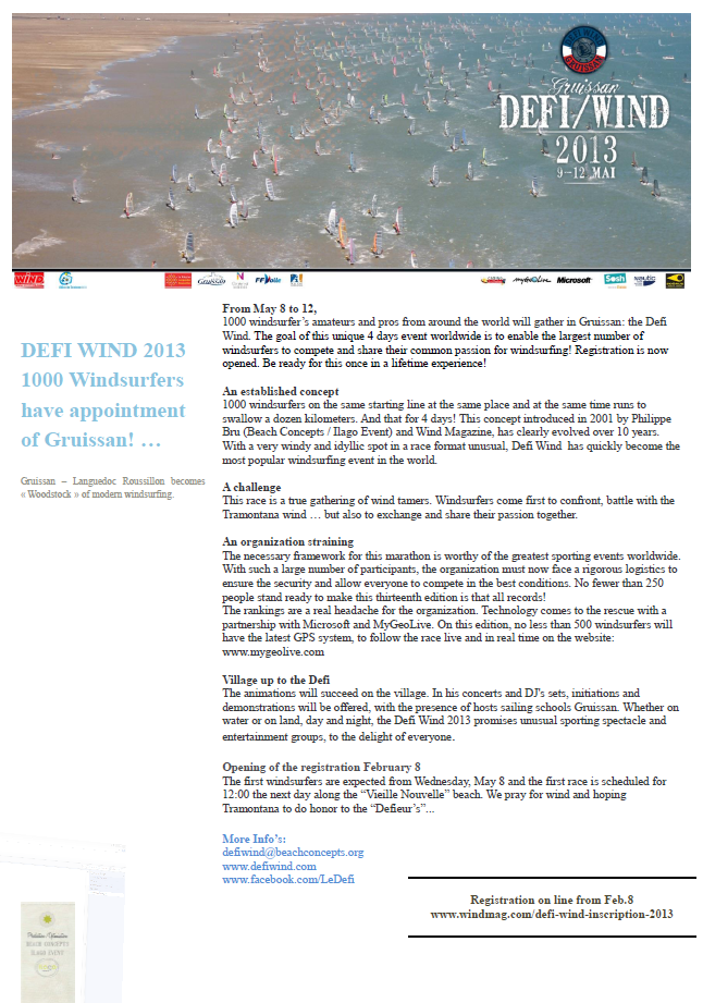 One of the biggest and most exciting windsurfing events in the world has opened up registration for the 2013 event. Defi Wind attracts windsurfers from...