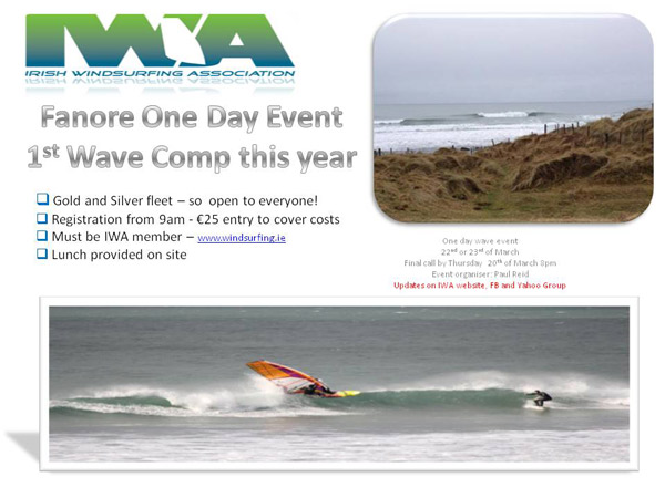 The Irish Windsurfing Association to hold it’s first wave competition of the year at Fanore, on the 22nd and 23rd of March. Full details below: Fanore...