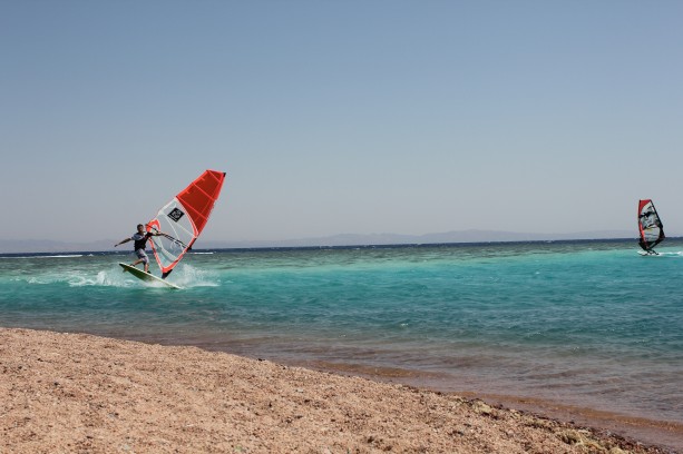 For me, once I become a competent ‘freerider’ e.g. blasting up and down water-starting and carve gybing. I felt that my first freestyle move was learning to duck gybe; this gave me the confidence to try more ‘old school’ moves including the body drag, downwind 360’s and heli-tacks. Aerial moves had always looked to scary for me to try, but on a trip out to Dahab, seeing a variety of people going for vulcans and with the support of other windsurfers around me. I finally mustered up the courage to start trying vulcans and quickly realised they do not result in death! From there found my freestyle windsurfing really started to improve. Try whatever you feel comfortable with and build from there!