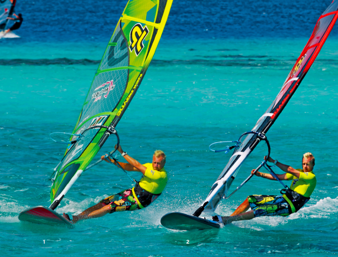 People who have just started to windsurf and are still struggling to get planing should use the furthest inside position as possible. As soon as you do not have problems anymore stepping in and out of the straps, you can try to improve your boards‘ performance by moving the straps a bit further outside, which requires the use of two back straps. This will make it more difficult to get in and out of the straps, but on the other hand standing further outside on the rail improves control in high winds – and more control means more speed when you‘re really powered up!