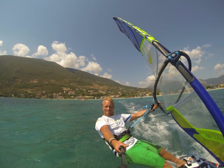 For going downwind it’s the opposite: The upper body is oriented more backwards, the front leg is almost stretched, the back leg slightly bent. Move your hands further down the boom.