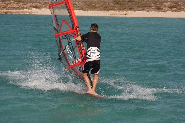 To keep the board turning, angle the rig back and down so that the clew almost touches and then passes over the tail. Imagine trying to knock a beer can off the back of the board. To counter balance against the rig, move the body, hands and feet forward. As the rig is angled back, wrap your front foot right around the mast base and move the whole body forward.
