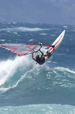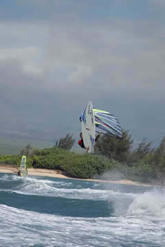 Maui is blessed with the Trade Winds which are accelerated on the north shore by the geography of the Island. Mount Haleakala rises to over 10,000 feet and is the perfect shape for the wind to funnel around. The wind generally blows from the NE which gives starboard tack wave riding. The trades are less consistent in the winter time, but the swell is larger which is why you should head to Maui over the winter months if you want the waves. Occasionally, Maui experiences Kona winds. These winds are the result of a pressure system and blow from left to right. In Kona winds there are still places to windsurf but usually on the other tack (port).